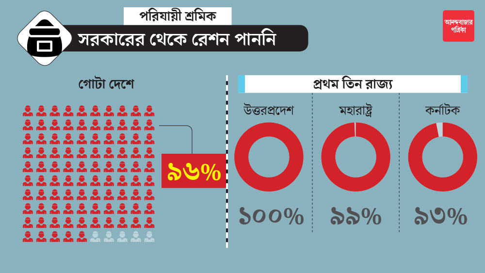 দেশ জুড়ে যে পরিযায়ী শ্রমিকদের উপর সমীক্ষা করা হয়েছে, তাঁদের ৯৬ শতাংশই সরকারের তরফে রেশন পাননি বলে অভিযোগ করেছেন। ওই সমীক্ষার রিপোর্ট অনুযায়ী, উত্তরপ্রদেশে ১১ হাজারেরও বেশি পরিযায়ী শ্রমিকের কারও কাছেই পৌঁছয়নি রেশনের খাদ্যসামগ্রী। অন্য দিকে, মহারাষ্ট্রেও ৯৯ শতাংশ পরিযায়ী শ্রমিক রেশন থেকে বঞ্চিত হয়েছেন। কর্নাটকে সেটা ৯৩ শতাংশ।