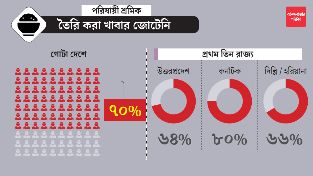 লকডাউন শুরু হতেই ভিন্ রাজ্যে কাজ হারানো বহু অস্থায়ী শ্রমিক নিরাপদ আশ্রয়ের খোঁজে নিজের রাজ্যের দিকে পা বাড়িয়েছিলেন। লকডাউনের বিধিনিষেধের জন্য গোটা দেশে পরিবহণ ব্যবস্থা বন্ধ থাকায় কাতারে কাতারে শ্রমিক হেঁটেই নিজের বাড়ির পথে রওনা হয়েছিলেন। প্রশাসনিক আশ্বাস সত্বেও দেশের ৭০ শতাংশ শ্রমিকই জানিয়েছেন, সরকার বা স্বেচ্ছাসেবী সংগঠন— কারও কাছ থেকেই তৈরি করা খাবার জোটেনি তাঁদের। এ ক্ষেত্রেও উত্তরপ্রদেশের পরিযায়ী শ্রমিকদের খারাপ অবস্থার কথা জানা গিয়েছে ওই সমীক্ষায়। ওই রাজ্যে সমীক্ষার আওতায় থাকা পরিযায়ী শ্রমিকদের ৬৪ শতাংশই জানিয়েছেন, তাঁদের জন্য তৈরি করা খাবারের বন্দোবস্ত করা ছিল না। কর্নাটকে ৮০ শতাংশ পরিযায়ী শ্রমিকদের এই দশা হয়েছে। অন্য দিকে, দিল্লি এবং হরিয়ানায় ওই হার শতাংশের হিসাবে যথাক্রমে ৫৮ এবং ৬৬ শতাংশ।