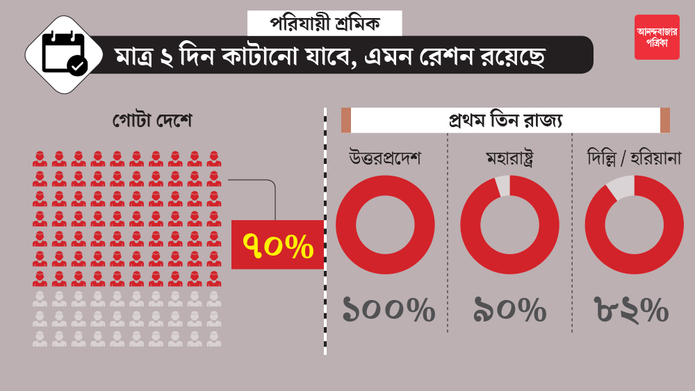 এই পরিযায়ী শ্রমিকেরা সরকারের তরফেও নিরাশ হয়েছেন। দেশ জুড়ে সমীক্ষা করা ওই শ্রমিকদের মধ্যে ৭০ শতাংশই জানিয়েছেন, রেশন থেকে যা খাদ্যসামগ্রী পেয়েছিলেন, তাতে মাত্র দু’দিন চলে। এ ক্ষেত্রেও যোগী আদিত্যনাথ সরকারের রাজ্য উত্তরপ্রদেশের পরিযায়ী শ্রমিকদের শোচনীয় অবস্থা। সমীক্ষার আওতায় থাকা শ্রমিকদের সকলেই একই দশা অর্থাৎ দু’দিনের রেশন রয়েছে তাঁদের কাছে। মহারাষ্ট্রের পরিযায়ী শ্রমিকদের মধ্যে সমীক্ষার আওতায় থাকা ৯০ শতাংশেরও একই অবস্থা। অন্য দিকে, দিল্লি ও হরিয়ানার ক্ষেত্রে এই সংখ্যাটা ঠেকেছে ৮২ শতাংশে।