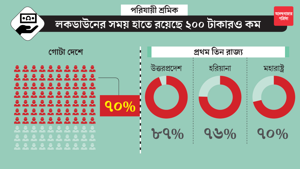 লকডাউনের মাঝে দেশ জুড়ে মোট ১১ হাজার ১৫৯ জন পরিযায়ী শ্রমিকের উপর করা একটি সমীক্ষায় দেখা গিয়েছে, ওই শ্রমিকদের ৯৬ শতাংশই ৮ থেকে ১৩ এপ্রিল— এই পাঁচ দিন সরকারের কাছ থেকে কোনও রেশন পাননি। ২৫ মার্চ দেশ জুড়ে লকডাউন শুরু হওয়ার পর ওই শ্রমিকদের ৯০ শতাংশের বেশি মজুরি পাননি মালিকপক্ষের কাছ থেকে। ফলে ২৭ মার্চ থেকে ১৩ এপ্রিল পর্যন্ত অন্তত ৭০ শতাংশের হাতে ছিল মাত্র ২০০ টাকা, সেটাই একমাত্র ভরসা।