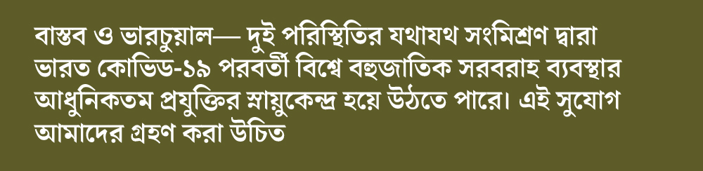 বাস্তব ও ভারচুয়াল— দুই পরিস্থিতির যথাযথ সংমিশ্রণ দ্বারা ভারত কোভিড-১৯ পরবর্তী বিশ্বে বহুজাতিক সরবরাহ ব্যবস্থার আধুনিকতম প্রযুক্তির স্নায়ুকেন্দ্র হয়ে উঠতে পারে। এই সুযোগ আমাদের গ্রহণ করা উচিত।
