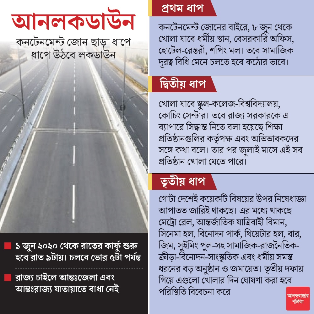• প্রথম ধাপে আগামী ৮ জুন থেকে ধর্মীয় স্থান, বেসরকারি অফিস, হোটেল-রেস্তরাঁ, শপিং মল সব কিছুই খুলে যাবে। তবে সামাজিক দূরত্ব বিধি মেনে চলতে হবে কঠোর ভাবে।