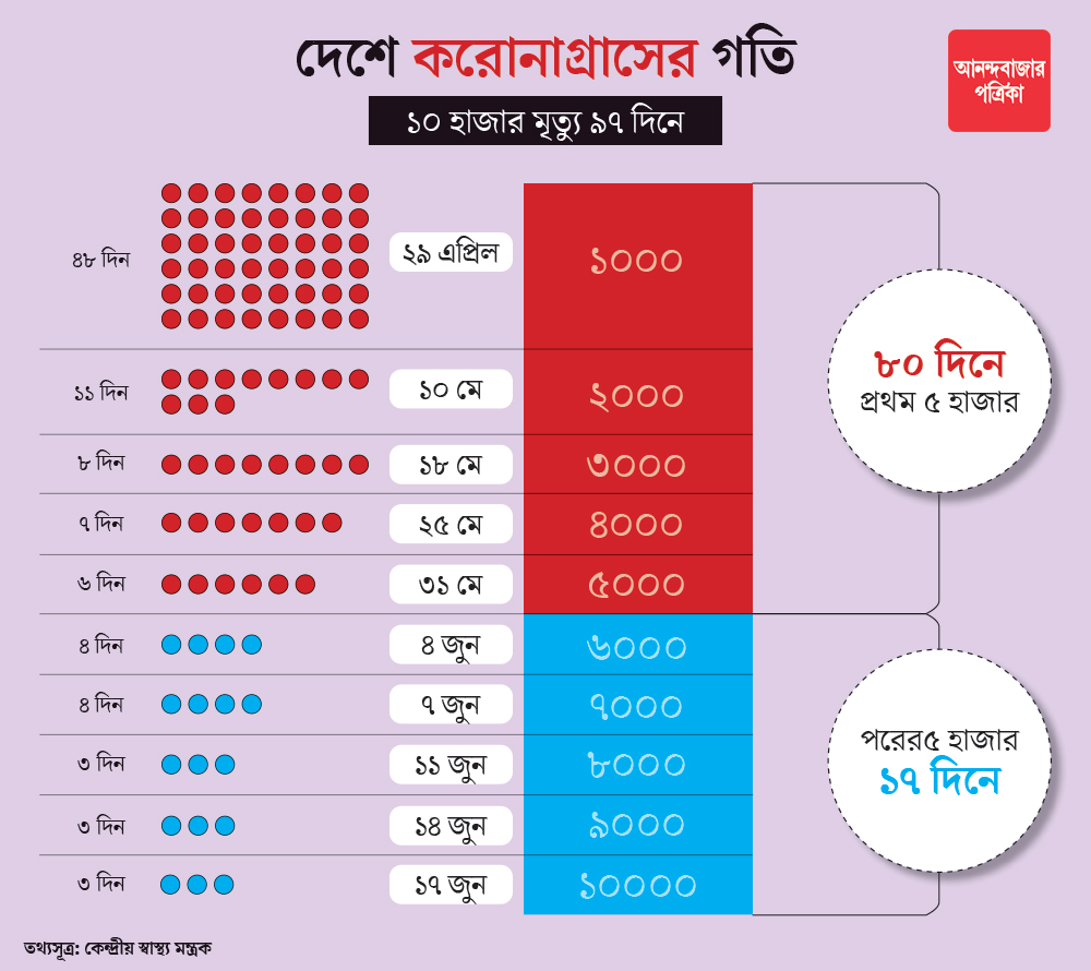 দেশে সংক্রমণও যেমন বেড়েছে, পাল্লা দিয়ে বেড়েছে মৃত্যুও। করোনা সংক্রমণের পর প্রথম মৃত্যু হয়েছিল ১২ মার্চ। ২৯ এপ্রিল সেই সংখ্যা হাজারে পৌঁছেছিল। অর্থাৎ প্রথম মৃত্যু থেকে এক হাজারে পৌঁছতে সময় লেগেছিল ৪৮ দিন। তার পর প্রতি হাজার বৃদ্ধিতে কমেছে সময়। এক হাজার থেকে দু’হাজার বেড়েছিল মাত্র ১১ দিনে। এ ভাবে প্রথম পাঁচ হাজার মৃত্যু হয়েছিল ৮০ দিনে। কিন্তু তার পর বৃদ্ধিটা হয়েছে লাফিয়ে লাফিয়ে। পাঁচ হাজার থেকে ১০ হাজারে পৌঁছতে লাগল মাত্র ১৭ দিন। তবে এক দিনে ২০০০ মৃত্যু বৃদ্ধি, নতুন করে উদ্বেগ সৃষ্টি করল।