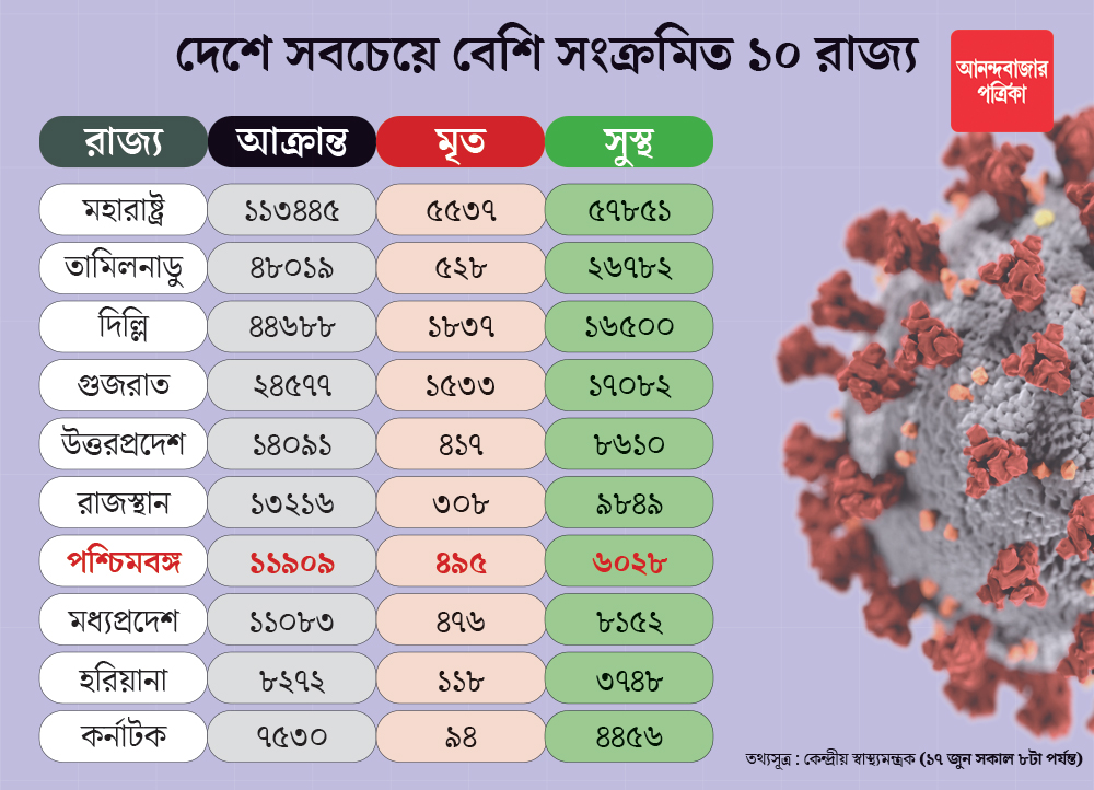 দেশে করোনাভাইরাসে আক্রান্তের সংখ্যাও রোজ লাফিয়ে লাফিয়ে বেড়ে চলেছে। কেন্দ্রীয় স্বাস্থ্য মন্ত্রকের তথ্য অনুসারে, গত ২৪ ঘণ্টায় দেশে ১০ হাজার ৯৭৪ জন নতুন করে কোভিডে আক্রান্ত হয়েছেন। এ নিয়ে মোট তিন লক্ষ ৫৪ হাজার ৬৫ জন আক্রান্ত হলেন দেশে। রাজ্যগুলির মধ্যে শীর্ষে রয়েছে মহারাষ্ট্র (১,১৩,৪৪৫)। হু হু করে সংক্রমণ বাড়ছে সেখানে। গত ২৪ ঘণ্টায় দু’হাজার ৭০১ জন নতুন করে আক্রান্ত হয়েছেন সেখানে। দ্বিতীয় স্থানে থাকা তামিলনাড়ু (৪৮,০১৯) ও তৃতীয় স্থানে থাকা দিল্লি (৪৪,৬৮৮) এগোচ্ছে পঞ্চাশ হাজারের দিকে।
