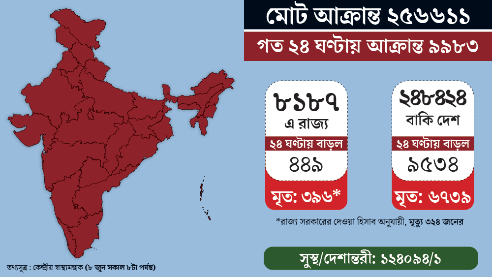 কেন্দ্রীয় স্বাস্থ্যমন্ত্রকের তথ্য অনুসারে, গত ২৪ ঘণ্টায় পশ্চিমবঙ্গে নতুন করে করোনায় আক্রান্ত হয়েছেন ৪৪৯ জন। এ নিয়ে রাজ্যে মোট আক্রান্ত হলেন আট হাজার ১৮৭ জন। এ রাজ্যে মোট মৃত্যু হয়েছে ৩৯৬ জনের। যদিও পশ্চিমবঙ্গ সরকারের হিসাব অনুসারে, সরাসরি করোনার কারণে রাজ্যে মৃত্যু হয়েছে ৩২৪ জনের। ৭২ জনের মৃত্যু হয়েছে কোমর্বিটিডিতে। করোনার কারণে গত ২৪ ঘণ্টায় রাজ্যে ১৩ জনের মৃত্যু হয়েছে।
