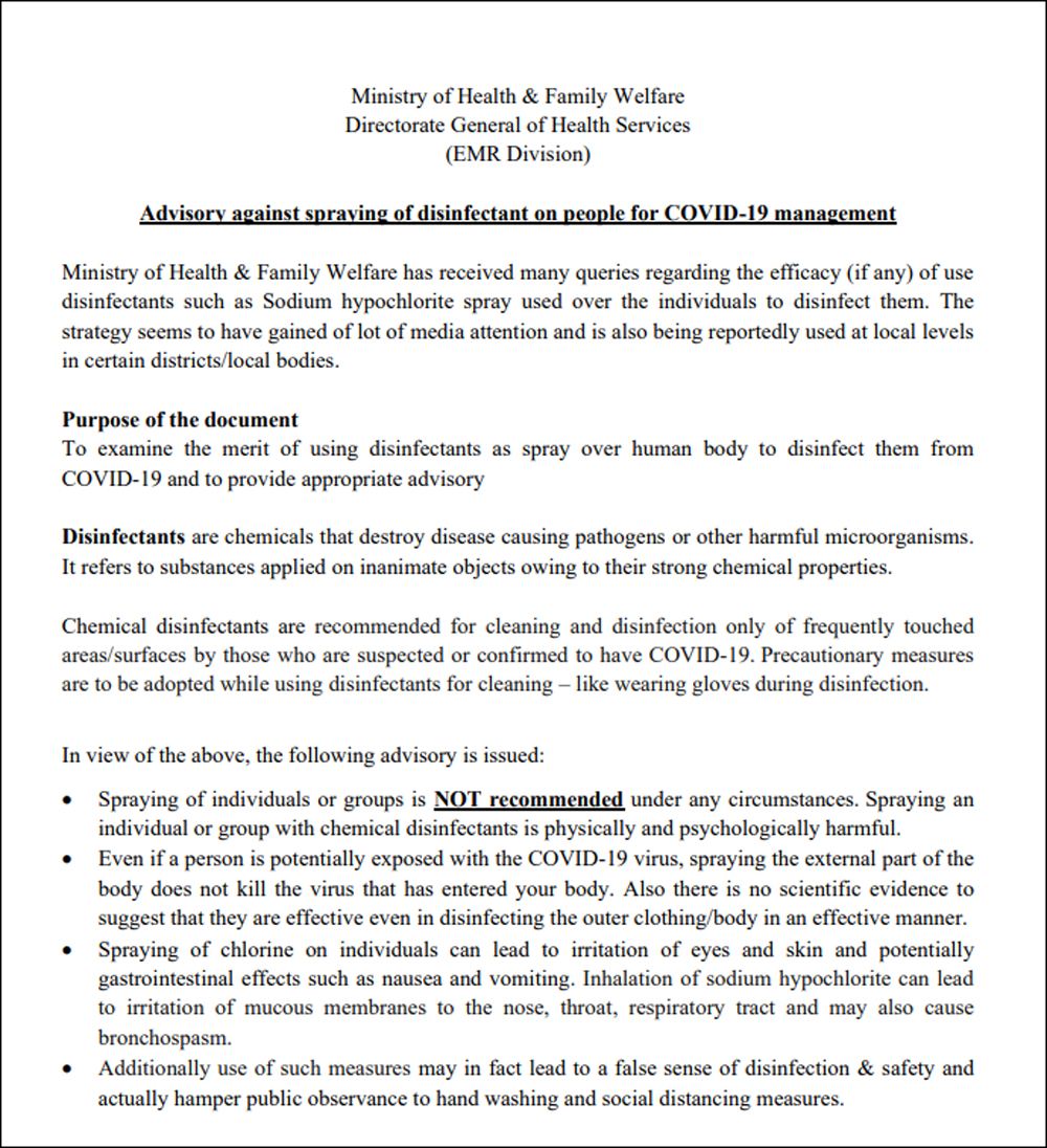 এই স্প্রেতে জীবাণুনাশক হিসেবে ব্যবহার করা হয় সোডিয়াম হাইপোক্লোরিন। ওই নির্দেশিকায় বলা হয়েছে, ‘‘কোনও ব্যাক্তি বা দলের উপর কোনও পরিস্থিতিতেই জীবাণুনাশক স্প্রে করা বাঞ্ছনীয় নয়। কারও উপর এই রাসায়নিক জীবাণুনাশক স্প্রে করলে তাঁর শারীরিক ও মানসিক ক্ষতি হতে পারে।’’