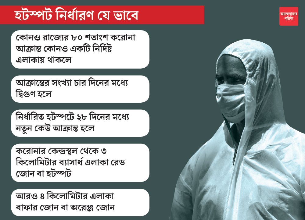 বুধবারই কেন্দ্রীয় স্বাস্থ্যমন্ত্রকের যুগ্মসচিব লব আগরওয়াল জানিয়েছেন, হটস্পটগুলি চিহ্নিত হয়েছে সংক্রমণের প্রবণতার উপর ভিত্তি করে। স্বাস্থ্যমন্ত্রকের হিসেবে যে সব এলাকায় আক্রান্তের সংখ্যা সবচেয়ে বেশি, সেগুলিকেই হটস্পট হিসেবে চিহ্নিত করা হয়েছে। অর্থাৎ রাজ্যের কোনও এলাকায় ৮০ শতাংশ বা তার বেশি আক্রান্ত রোগীর সংখ্যা থাকলে, সেটাকে হটস্পট হিসেবে ধরা হয়েছে।