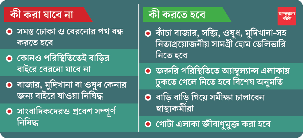 এই হটস্পটগুলিতে কী করা যাবে এবং কী করা যাবে না, তা নিয়ে একটি কড়া গাইডলাইন দিয়েছে কেন্দ্র। সেই অনুযায়ী এই হটস্পটগুলি কার্যত সিল করে দেওয়া হয়েছে। কার্যত কোনও পরিস্থিতিতেই ঘর থেকে বেরতে পারবেন না এলাকাবাসী।