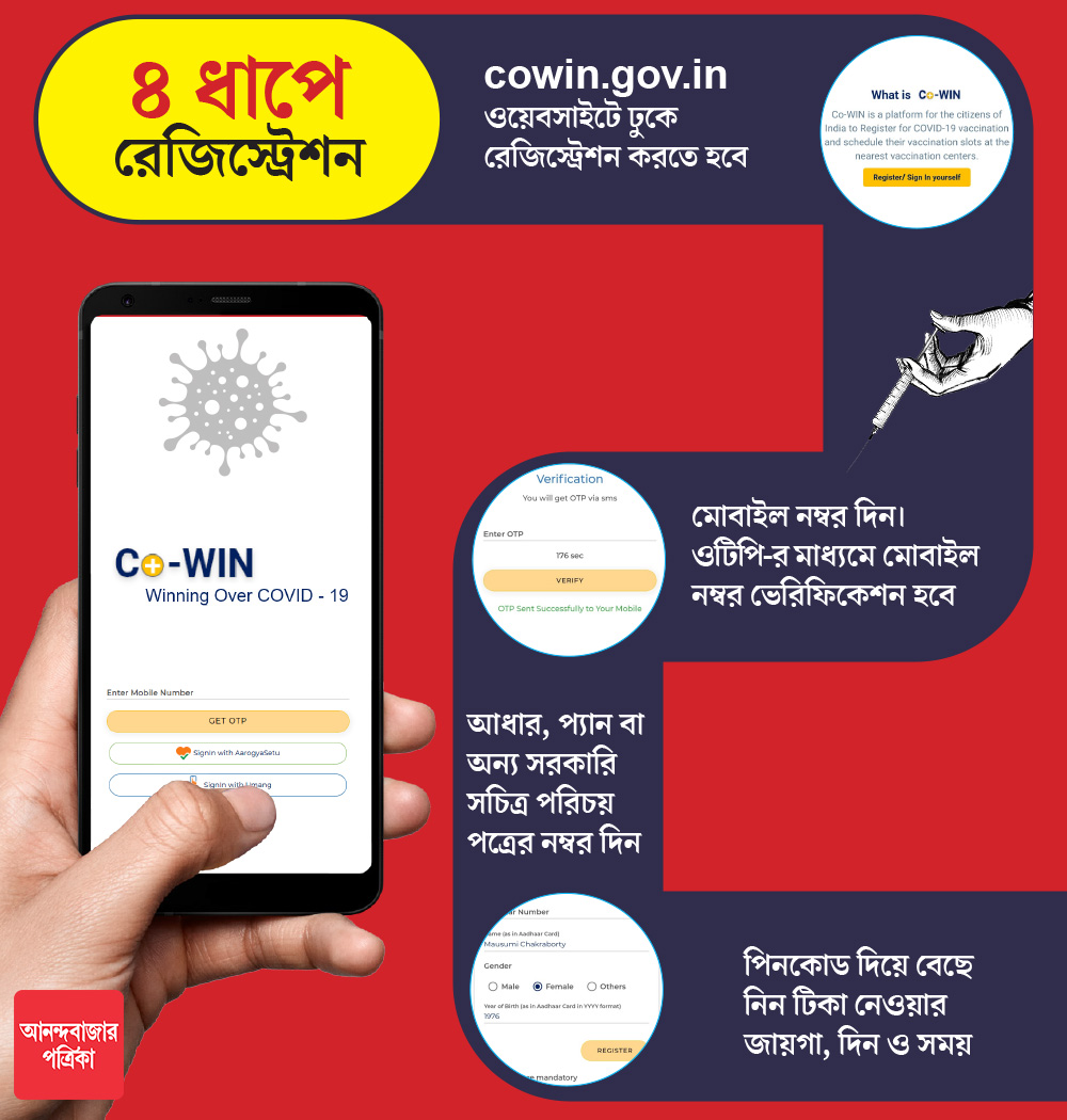 তবে ৪৫ বছর বয়সের ঊর্ধ্বদের জন্য এই নতুন নিয়ম নয়। তাঁরা আগের মতোই সরাসরি টিকাকেন্দ্রে গিয়ে কোউইন অ্যাপে নাম নথিভুক্ত করতে পারবেন। ১৮ থেকে ৪৫ বছর বয়সিদের জন্য ২৮ এপ্রিল থেকেই শুরু হবে এই নাম নথিভুক্তকরণ। সরাসরি কোউইন অ্যাপ প্ল্যাটফর্মে গিয়ে নাম নথিভুক্ত করা যাবে।