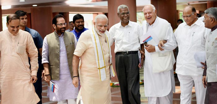 সর্বদল বৈঠকের পর নরেন্দ্র মোদী, ন্যাশনাল কনফারেন্সের ফারুক আবদুল্লা-সহ অন্যান্য নেতা।