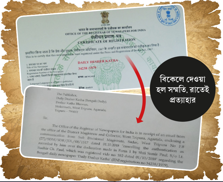 আগরতলার মেলার মাঠ থেকে প্রকাশিত ওই মুখপত্র দৈনিক হিসেবে চালু ছিল ১৯৭৯ সাল থেকে। ত্রিপুরার দ্বিতীয় সর্বাধিক প্রচারিত দৈনিক এখন। বন্ধ করার নোটিস দেওয়ার জন্য কাগজের মালিকানা সংক্রান্ত একটি ‘টেকনিক্যাল’ কারণকে দায়ী করেছেন সংশ্লিষ্ট কর্তৃপক্ষ। এক সময়ে মুখপত্র ছিল সরাসরি সিপিএম রাজ্য কমিটির দ্বারা প্রকাশিত, সম্পাদক ছিলেন দলের নেতা গৌতম দাশ। পরে একটি সোসাইটির হাতে কাগজের মালিকানা হস্তান্তর হয়। বদল হয় সম্পাদকও। সিপিএম নেতৃত্বের বক্তব্য, ২০১২ থেকে ২০১৫ সালের মধ্যে তাঁরা ওই পরিবর্তন সংক্রান্ত যাবতীয় নথিপত্র জেলাশাসকের দফতর এবং আরএনআই-এর কাছে জমা দিয়েছিলেন। কিন্তু আরএনআই-এর সাইটে কাগজের সম্পাদকের নাম বদল হয়নি। কয়েক মাস আগে চোখে পড়ার পরে রাজ্যের প্রাক্তন অ্যাডভোকেট জেনারেল বিকাশ ভট্টাচার্যের সঙ্গে পরামর্শ করে কাগজ পরিচালনার ভার একটি ট্রাস্টের হাতে তুলে দেওয়ার সিদ্ধান্ত হয়। সেইমতো আইনি প্রক্রিয়া সম্পন্ন হওয়ার পরে আরএনআই-এর শংসাপত্র আসে সোমবার বিকালে। কিন্তু নাটকের তখনও বাকি ছিল!