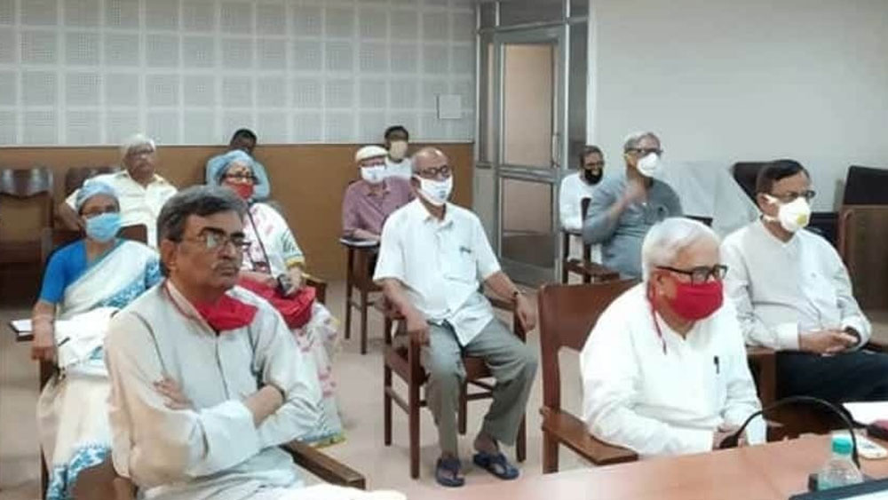 আলিমুদ্দিন স্ট্রিট থেকে ভিডিয়ো কনফারেন্সে কেন্দ্রীয় কমিটির বৈঠকে যোগ বাংলার সিপিএম নেতাদের। —নিজস্ব চিত্র।