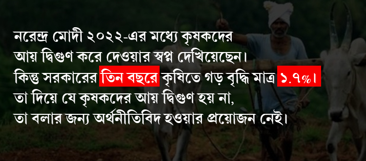 নরেন্দ্র মোদী ২০২২-এর মধ্যে কৃষকদের আয় দ্বিগুণ করে দেওয়ার স্বপ্ন দেখিয়েছেন। কিন্তু তাঁর পরিসংখ্যান মন্ত্রকই বলছে, এ বছর কৃষি ক্ষেত্রে বৃদ্ধির হার ২.১ শতাংশে আটকে থাকবে। মোদী সরকারের তিন বছরে কৃষিতে গড় বৃদ্ধি মাত্র ১.৭%। তা দিয়ে যে কৃষকদের আয় দ্বিগুণ হয় না, তা বলার জন্য অর্থনীতিবিদ হওয়ার প্রয়োজন নেই।