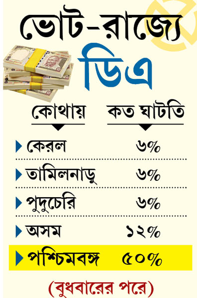 বাম-কংগ্রেস জোট এমনিতেই মমতা বন্দ্যোপাধ্যায়ের ঘুম কেড়ে নিয়েছে। তার উপরে বিধানসভা ভোট শুরুর দশ দিন আগে কেন্দ্রীয় সরকারের এক কিস্তি মহার্ঘভাতা (ডিএ) ঘোষণা আরও বাড়িয়ে দিল তাঁর রক্তচাপ। ডিএ বকেয়ায় দেশের শীর্ষস্থান দখল করে ফেলা রাজ্যে কোন যুক্তিতে খয়রাতির বন্যা বইয়ে দেওয়া যায়, কর্মীমহল সেই প্রশ্নে উত্তাল।