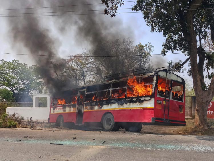 বিক্ষোভে জ্বলছে বাস। ছবি: পিটিআই