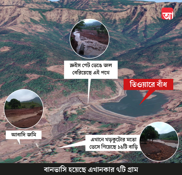 জলোচ্ছ্বাসে বাঁধের স্লুইস গেট ভেঙে যাওয়ায় মহারাষ্ট্রের রত্নগিরি জেলায় বানভাসি হয়েছে সাতটি গ্রাম। বাঁধ-লাগোয়া অন্তত ১২টি বাড়ি ধুয়েমুছে সাফ হয়ে গিয়েছে। মৃতের সংখ্যা এখনও পর্যন্ত ৬। নিখোঁজ অন্তত ২০ জন। তিওয়ারে বাঁধের স্লুইস গেট ভেঙেছে মঙ্গলবার রাত সাড়ে ৯টা নাগাদ।