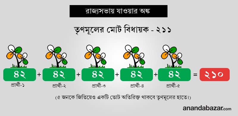 রাজ্যসভা নির্বাচনের জন্য মনোনয়ন পত্র জমা দেওয়ার সময় শুরু হচ্ছে ২২ মে থেকে। পশ্চিমবঙ্গ থেকে নির্বাচিত যে ৬ সাংসদের মেয়াদ এ বার শেষ হচ্ছে, তাঁরা হলেন দোলা সেন, সুখেন্দুশেখর রায়, দেবব্রত বন্দ্যোপাধ্যায়, ডেরেক ও’ব্রায়েন, সীতারাম ইয়েচুরি এবং প্রদীপ ভট্টাচার্য। এঁদের মধ্যে প্রথম চার জন তৃণমূলের। বাকি দু’জন সিপিএমের এবং কংগ্রেসের। এ বার যে হেতু ৬টি আসনে নির্বাচন, সে হেতু জিততে হলে প্রত্যেক প্রার্থীকে ন্যূনতম ৪২ জন বিধায়কের ভোট পেতে হবে। তৃণমূলের টিকিটে জিতে আসা বিধায়কের সংখ্যা যে হেতু ২১১, সে হেতু সোজাসাপ্টা হিসেবেই তৃণমূলের ৫ জন প্রার্থী ৪২টি করে ভোট পেয়ে যাবেন।