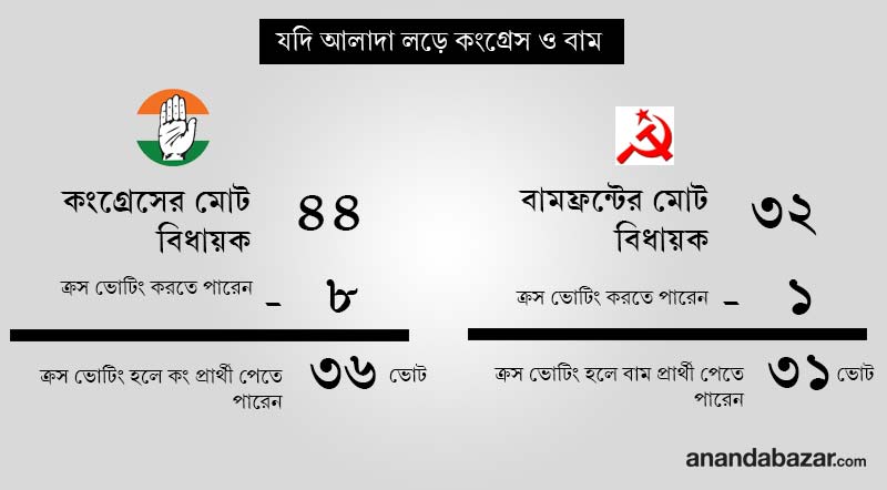 বামেদের আসন সংখ্যা আরও কম। সব মিলিয়ে ৩২ জন বিধায়ক বামফ্রন্টের। তাঁদের মধ্যে মালদহের এক বাম বিধায়ক আবার দল বদলে তৃণমূলে চলেও গিয়েছেন। ফলে আলাদা প্রার্থী দিয়ে জিতিয়ে আনা বামেদের পক্ষে আরও কঠিন।