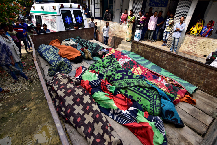 গোলাঘাটের সরকারি হাসপাতালের বাইরে শবদেহের লাইন। ছবি: পিটিআই।