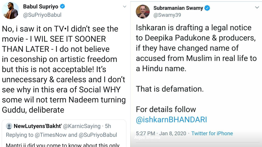 অন্য দিকে বিজেপি নেতা সুব্রহ্মণ্যম স্বামীর টুইট, “সিনেমায় সত্যি যদি এ ভাবে মুসলিম নামকে হিন্দু করে দেওয়া হয়, তাহলে আইনি নোটিস পাঠানো হবে। এটা মানহানি।” বিজেপি নেতা বাবুল সুপ্রিয় টুইটারে লেখেন, “সিনেমাটা আমি দেখিনি। তবে ছবিটি দেখব। শিল্পের স্বাধীনতায় হস্তক্ষেপে আমি বিশ্বাস করি না। কিন্তু এটা মেনে নেওয়া যায় না। এটা অপ্রয়োজনীয় এবং দায়িত্বজ্ঞানহীন।...”