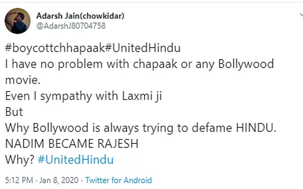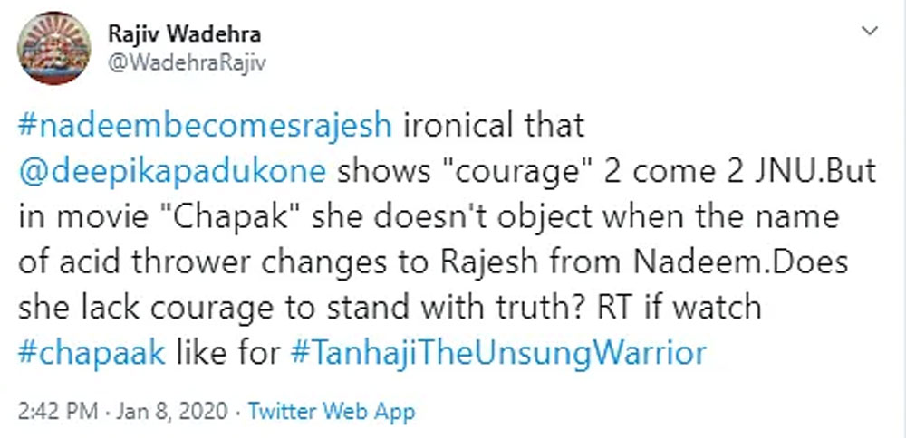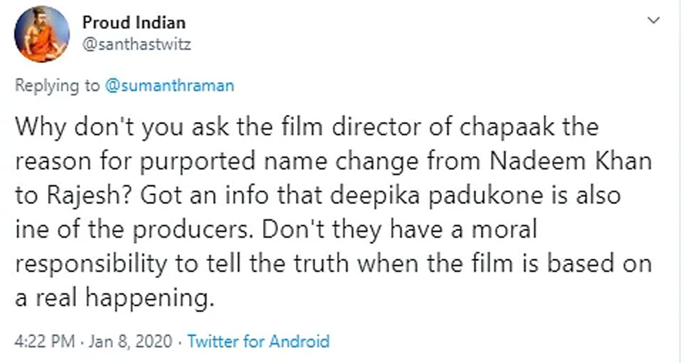 আর এতেই আক্রমণের ‘রসদ’ পেয়ে যান নেটিজেনরা। যেখানে বাস্তব ঘটনার উপর ভিত্তি করে তৈরি সিনেমা, সেখানে রিয়েল লাইফের ‘নঈম খান’ (মুসলিম যুবক) কী ভাবে সিনেমায় রাজেশ (হিন্দু) হয়ে গেলেন তাই নিয়ে প্রশ্ন তুলে দীপিকাকে ব্যাপক আক্রমণ শুরু হয়। এমনকি, এতে হিন্দু সম্প্রদায়কে অপমান করার চেষ্টা হয়েছে বলেও অনেকে মন্তব্য করেন টুইটারে।