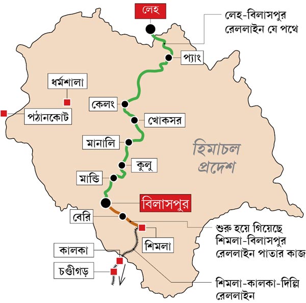 হিমাচল প্রদেশের বিলাসপুর থেকে মানালি হয়ে এ বার সরাসরি লেহ পর্যন্ত রেললাইন পাতার সিদ্ধান্ত নিল প্রতিরক্ষা ও রেল মন্ত্রক। আজ ৪৯৮ কিলোমিটার দীর্ঘ ওই লাইনের সমীক্ষার কাজ শুরু করার সবুজ সঙ্কেত দেন রেলমন্ত্রী সুরেশ প্রভু। ওই লাইন তৈরি হয়ে গেলে লাদাখের সঙ্গে সরাসরি যোগাযোগ তৈরি হবে মূল ভূখণ্ডের। জরুরি পরিস্থিতিতে সেনা ও রসদ দ্রুত পৌঁছে দেওয়া সম্ভব হবে চিন-পাকিস্তান লাগোয়া সীমান্তে। পর্যটকেরাও ট্রেনে চড়েই সরাসরি পৌঁছতে পারবেন লেহ-লাদাখ এলাকায়। তবে ধস ও ভূমিকম্পপ্রবণ ওই জমিতে কোন পথে, কী প্রযুক্তির সাহায্যে লাইন পাতা হবে, সেটাই এখন বড় চ্যালেঞ্জ রেলের কাছে।