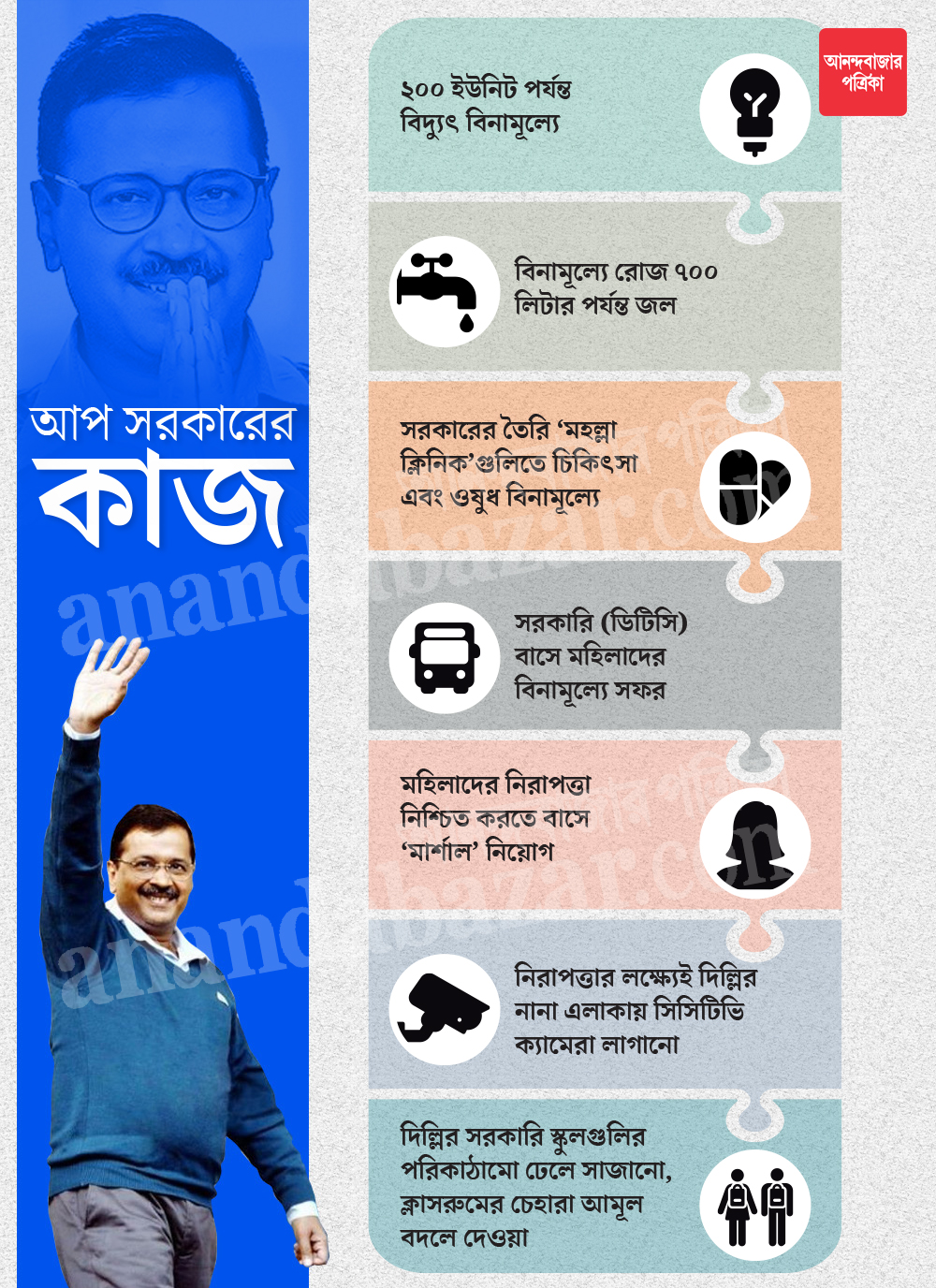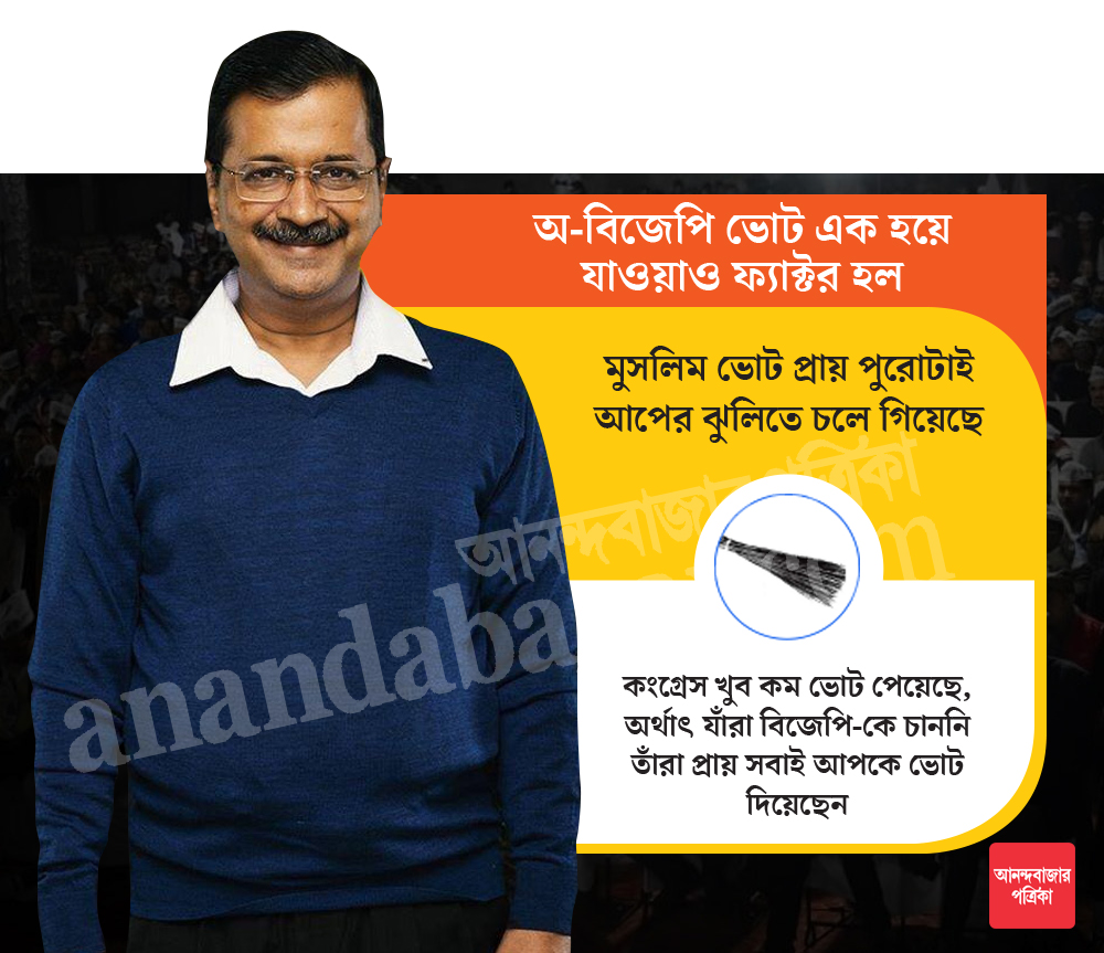 জল, বিদ্যুৎ থেকে শুরু করে স্বাস্থ্য, শিক্ষা— নিরাপৎতা থেকে শুরু করে মেয়েদের বাসভাড়া— এ সব ফ্যাক্টর মানুষের মন জয়ে যে কাজ করেছে, তা নিয়ে অনেকেই নিঃসন্দেহ। কিন্তু কেজরীকে একই সঙ্গে লড়তে হয়েছে নরেন্দ্র মোদী-অমিত শাহের মতো মহা-ওজনদার জুটির বিরুদ্ধে। লড়তে হয়েছে বিজেপির জাতীয়তাবাদী প্রচার এবং হিন্দু ভোট এককাট্টা করার কৌশলের বিরুদ্ধে।