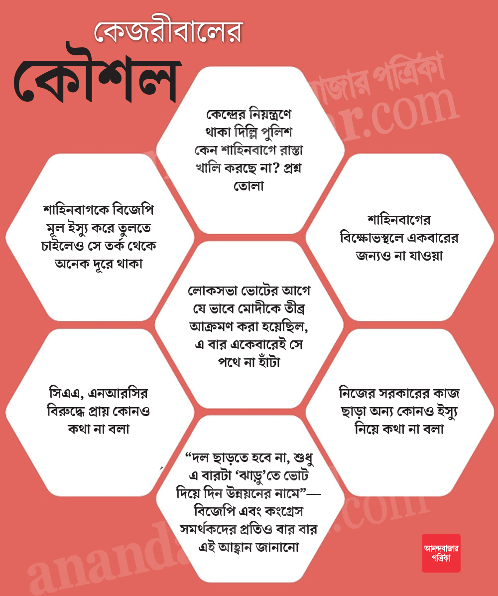 এখানেই বিজেপির কৌশলের পিছনে না ছুটে, শেষ পর্যন্ত নিজের কৌশলেই খেলেছেন কেজরী। সিএএ থেকে শাহিন বাগের মতো ইস্যু, যা নিয়ে সাড়া দেশ তোলপাড় হয়েছে, তাতে ঢুকে পড়ায় ঝুঁকি আছে বুঝে পাশ কাটিয়ে গিয়েছেন।