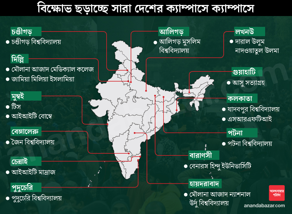 রাতের বেলাতেই আইআইটি বোম্বে, জেএনইউ, যাদবপুর, পন্ডিচেরি বিশ্ববিদ্যালয়ের ছাত্রছাত্রীরা একজোট হয়ে ‘পুলিশি জুলুমের’ প্রতিবাদ কর্মসূচির পরিকল্পনা করেন। সকাল হতেই চেনা ছবিগুলি বদলতে থাকে ক্যাম্পাসগুলির। ক্লাস বয়কট করেন মুম্বইয়ের টাটা ইন্সটিউট অব সোশ্যাল সায়েন্সের ছাত্ররা। ক্লাস বয়কট করে চেন্নাই, মুম্বই আইআইটির ছাত্ররাও। রাস্তায় নেমে পড়েন হায়দরাবাদের মৌলনা আজাদ উর্দু বিশ্ববিদ্যালয় ও বারাণসীর বেনারস হিন্দু বিশ্ববিদ্যালয়ের ছাত্ররা।
