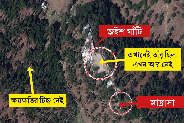 নানা মহল থেকে বালাকোটে পাহাড়ের মাথায় জইশ-ই-মহম্মদের চালানো মাদ্রাসাটি ধ্বংসের কথা বলা হচ্ছে। তার প্রমাণ হিসেবে সম্প্রতি একটি উপগ্রহ চিত্র ভাইরাল হয়— যেটি ফোটোশপে বানানো বলে সন্দেহ অনেকের। এর পরে একটি মার্কিন বেসরকারি স্যাটেলাইট অপারেটর ‘প্ল্যানেট ল্যাবস ইনকর্পোরেট’-কে দিয়ে বালাকোটের একটি ছবি তোলায় সংবাদ সংস্থা রয়টার্স। মার্চের ৪ তারিখে তোলা হাই রেজ়োলিউশনের সেই ছবিতে স্পষ্ট দেখা যাচ্ছে, জাবা গ্রামের অদূরে পাহাড়ের মাথায় সেই মাদ্রাসাটি দিব্যি অক্ষত দাঁড়িয়ে রয়েছে। তার ছাদে কোনও গর্ত নেই, ভাঙনের কোনও চিহ্ন নেই দেওয়ালেও। গত বছর এপ্রিলে সংস্থাটি শেষ বার এই অঞ্চলের যে উপগ্রহ চিত্র তুলেছিল, তার সঙ্গে এখন তোলা ছবিটির কোনও অমিল নেই।
