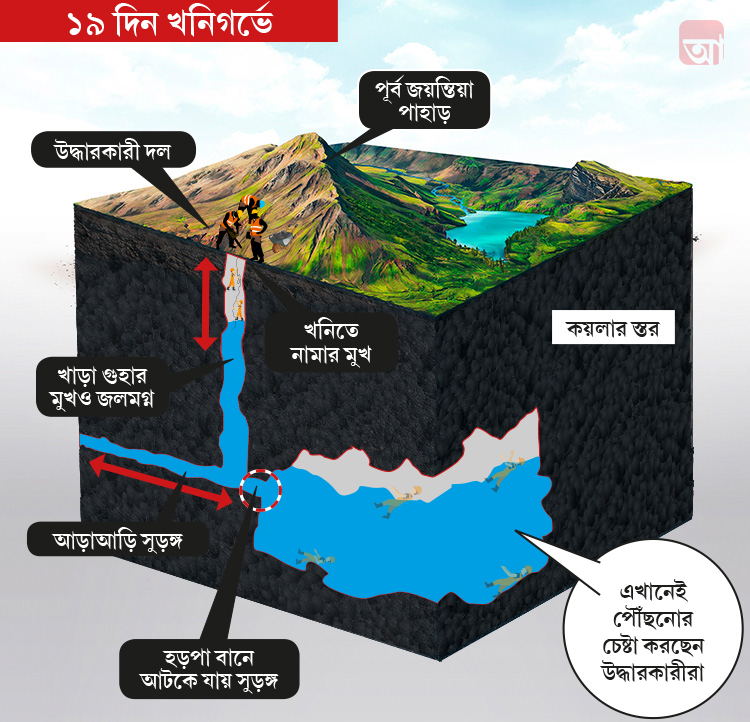 গত ১৩ ডিসেম্বর থেকে মেঘালয়ের বেআইনি খাদানে কয়লা তুলতে গিয়ে আটকে পড়েন স্থানীয় ১৫ জন। লাগোয়া একটি নদী থেকে জল ঢুকে বন্ধ হয়ে যায় ‘র্যাট হোল মাইন’-এর মুখ। তার দু’দিন পর থেকেই উদ্ধার কাজ শুরু হলেও তাতে তেমন গতি আসেনি। উদ্ধারে নামে জাতীয় বিপর্যয় মোকাবিলা দল, নৌসেনা, ওডিশা দমকল বিভাগ এবং কোল ইন্ডিয়া। কিন্তু সেই উদ্ধার কাজ কবে শেষ হবে, সে নিয়ে এখনও নিশ্চিত করে কেউ কিছু বলতে পারছেন না।