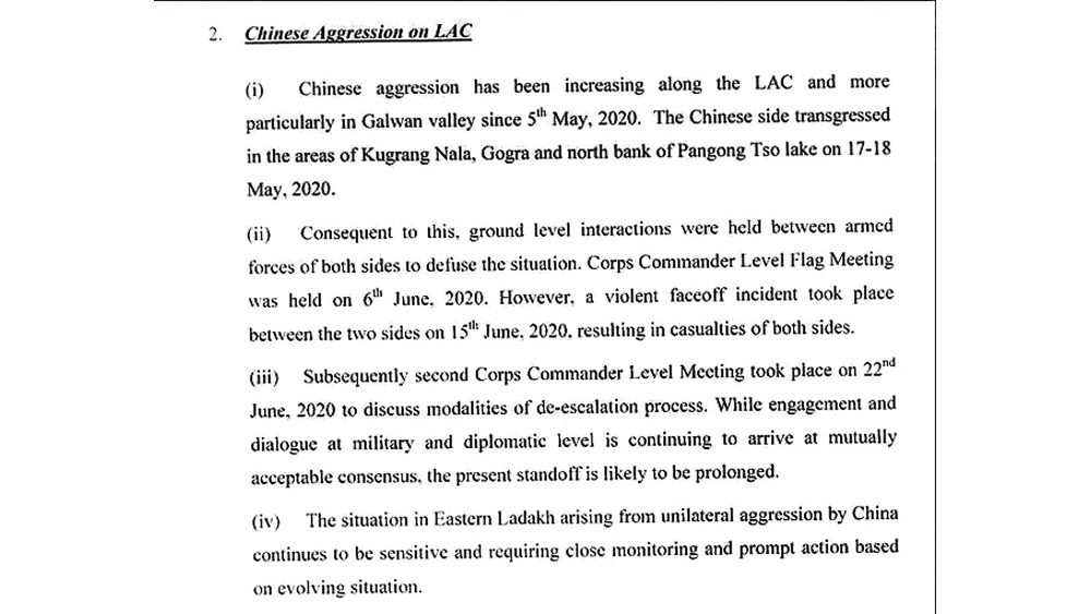 পূ্র্ব লাদাখে চিন সেনার অনুপ্রবেশ নিয়ে প্রধানমন্ত্রী জুন মাসের সর্বদলীয় বৈঠকে দাবি করেছিলেন, ভারতীয় ভূখণ্ডে কেউ অনুপ্রবেশ করেনি। ভারতীয় কোনও পোস্টও কেউ দখল করেনি। কিন্তু তাঁর কথাকে কার্যত মিথ্যা প্রতিপন্ন করে প্রতিরক্ষা মন্ত্রকের ওয়েবসাইটে জানানো হয়— মে-র গোড়া থেকেই প্রকৃত নিয়ন্ত্রণরেখায়, বিশেষ করে গালওয়ান উপত্যকায় চিনা আগ্রাসন দেখা যাচ্ছিল। চিনা সেনা ১৭-১৮ মে কুগরং নালা, গোগরা ও প্যাংগং লেকের উত্তর প্রান্তে প্রকৃত নিয়ন্ত্রণরেখা অতিক্রম করে।
