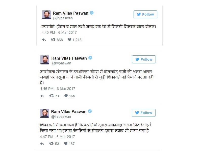 সম্প্রতি কেন্দ্রীয় ক্রেতা সুরক্ষা বিষয়ক মন্ত্রী রামবিলাস পাসোয়ান একটি টুইটবার্তায় এমনটাই জানিয়েছেন। জানা গিয়েছে, পানীয় জলের দামের হেরফের নিয়ে প্রায়ই গুচ্ছ গুচ্ছ অভিযোগ জমা পড়ে। এ বার সেই অভিযোগ খতিয়ে দেখেই এই সিদ্ধান্ত নেওয়া হয়েছে। দফতর সূত্রে খবর, এ বার থেকে পানীয় জলের দাম এমআরপি অনুযায়ীই নিতে হবে। এরপরেও যদি কোনও অসাধু ব্যবসায়ী অতিরিক্ত টাকা নিতে গিয়ে ধরা পড়েন, তা হলে তাঁকে জরিমানা দিতে হবে। এমনকী তাঁর জেলও হতে পারে বলে সতর্ক করে দিয়েছেন রামবিলাস পাসোয়ান।