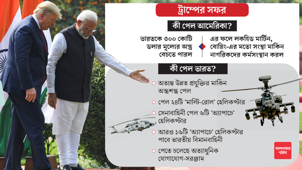 প্রতিরক্ষা ক্ষেত্রে এই লাভালাভের পাশাপাশি ভারত সফরে এসে ‘মুসলিম সন্ত্রাসবাদে’র বিরুদ্ধেও প্রকাশ্য যুদ্ধঘোষণা করেছেন মার্কিন প্রেসিডেন্ট। সন্ত্রাসবাদ দমনে ইসলামাবাদ কী করছে, গোটা বিশ্ব যে তার উপর নজর রাখছে, ট্রাম্প সে কথাও গত কাল পাকিস্তানকে ঠারেঠোরে বুঝিয়ে দিয়েছেন।