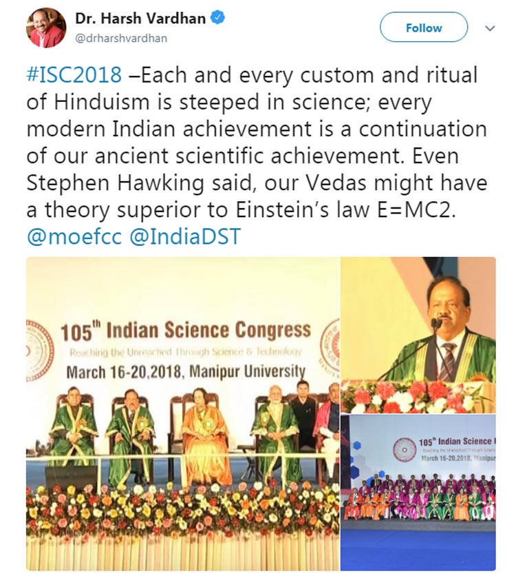 সেই প্রবাহে নতুন সংযোজন কেন্দ্রীয় বিজ্ঞান ও প্রযুক্তি মন্ত্রী হর্ষবর্ধনের মন্তব্য। শুক্রবার ইম্ফলে ১০৫তম জাতীয় বিজ্ঞান কংগ্রেসের উদ্বোধন করে হর্ষবর্ধন বলেন, ‘‘আইনস্টাইনের চেয়ে বেদ এগিয়ে। স্টিফেন হকিং বলেছিলেন, আইনস্টাইনের বিখ্যাত ‘‘e=mc2’’ সূত্রটির চেয়েও উন্নততর তত্ত্ব থাকতে পারে বেদে।’’