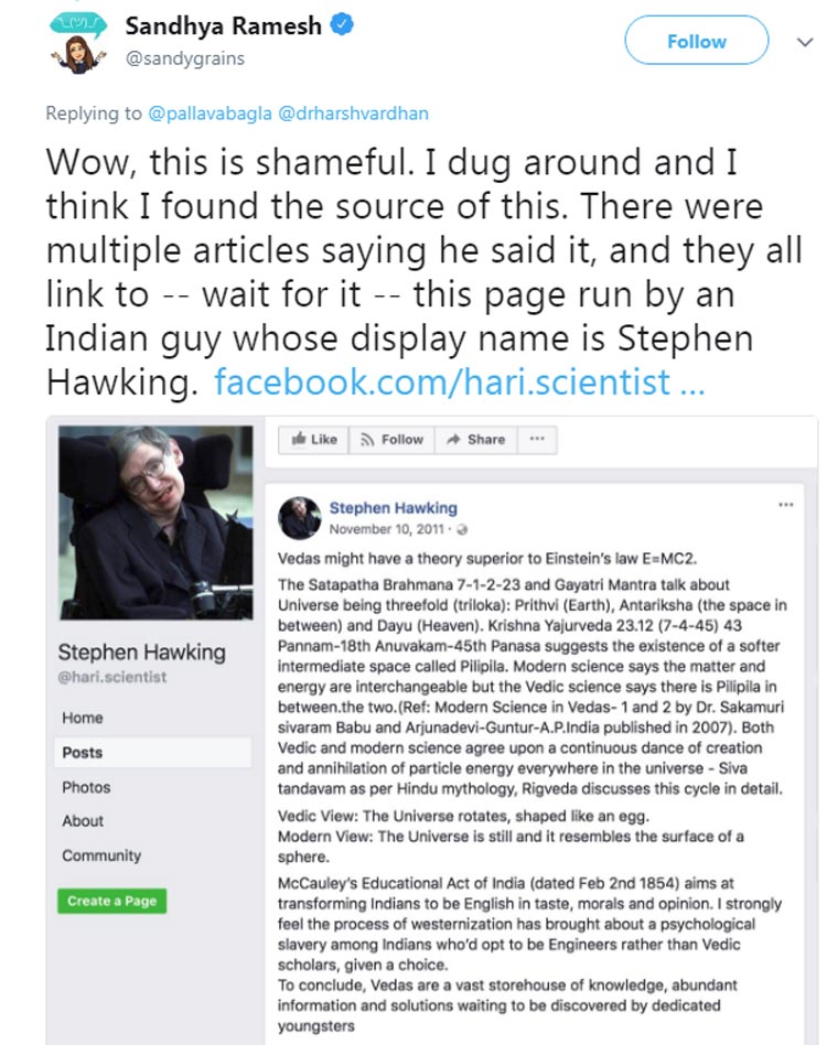 অনলাইন সংবাদসংস্থা ‘অল্ট নিউজ’-এর তদন্তে এও জানা গিয়েছে, ‘আই-সার্ভ’-এর ওই ওয়েবসাইটের করা ‘খবর’-এর বছরদু’য়েক আগে, ২০১১ সালে ‘hari.scientist’ নামে একটি ফেসবুক পেজে স্টিফেন হকিংয়ের নামে ওই মন্তব্যটি প্রকাশিত হয়েছিল। আর সেই ফেসবুক পেজের ‘ইউজার’ পেজ চালাতেন ‘স্টিফেন হকিং’ নামে, হকিংয়ের ছবি লাগিয়ে। যেন সত্যি সত্যিই হকিং বলছেন ওই কথা তাঁর ‘নিজস্ব ফেসবুক পেজ’-এ! অনলাইন নিউজ পোর্টাল ‘দ্যপ্রিন্ট’-এর সায়েন্স এডিটর সন্ধ্যা রমেশ এই তথ্য জানিয়েছেন।