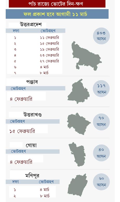 পাঁচ রাজ্যে ভোটের দিন-ক্ষণ ঘোষণা করে দিল নির্বাচন কমিশন। আগামী ৪ ফেব্রুয়ারি থেকে ৮ মার্চ পর্যন্ত উত্তরপ্রদেশ, পঞ্জাব, উত্তরাখণ্ড, মণিপুর এবং গোয়ায় বিধানসভা নির্বাচন। ফল প্রকাশ হবে আগামী ১১ মার্চ।