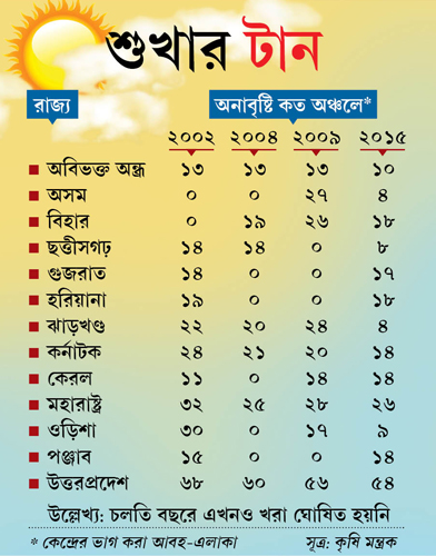 এবং এ হেন পরিস্থিতির মধ্যে সিঁদুরে মেঘ দেখছে কৃষি মন্ত্রক। কারণ তাদের হিসেব বলছে, দেশে উৎপাদিত মোট ফসলের ৭৫ শতাংশেরই জোগান আসে এই তল্লাট থেকে। তাই ওখানে চাষ মার খেলে গোটা দেশেই খাদ্য সরবরাহে টান পড়তে বাধ্য। ‘‘এই অবস্থাটা দু’মাস আগে দেখা দিলে এত চিন্তার কিছু ছিল না। পরে ভাল বৃষ্টি হয়ে ছবিটা ঘুরে যাওয়ার সুযোগ থাকত। এখন সে সুযোগ নেই।’’— আক্ষেপ করছেন এক আবহবিজ্ঞানী। কেন নেই?