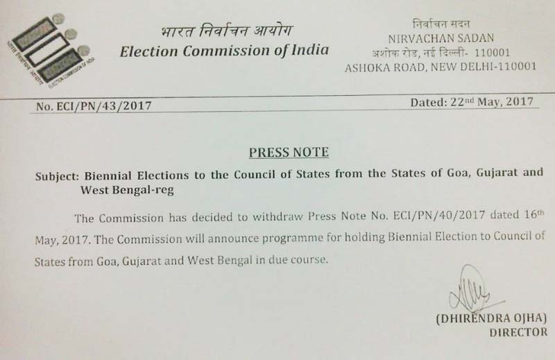 জাতীয় নির্বাচন কমিশন ১৬ মে বিজ্ঞপ্তি জারি করে জানিয়েছিল, ৮ জুন তিন রাজ্যে রাজ্যসভা নির্বাচন হবে। সোমবার আর একটি বিজ্ঞপ্তি জারি করে কমিশন আগের বিজ্ঞপ্তি প্রত্যাহার করে নিল। এই বিজ্ঞপ্তি প্রত্যাহারের অর্থ হল, ঘোষিত তারিখে রাজ্যসভার নির্বাচন হচ্ছে না, নির্বাচন পিছিয়ে যাচ্ছে। কমিশনের তরফে জানানো হয়েছে, রাজ্যসভা নির্বাচনের দিনক্ষণ পরে ঘোষণা করা হবে। কিন্তু কী কারণে নির্বাচন পিছিয়ে দেওয়া হল, সে কথা বিজ্ঞপ্তিতে লেখা হয়নি।
