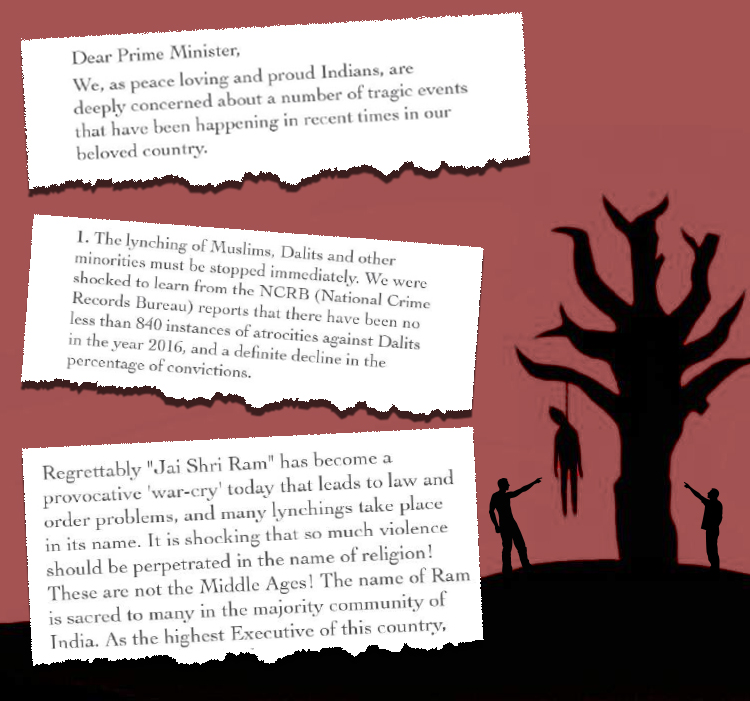 ২০১৪-য় মোদী-জমানা শুরুর পর থেকে দলিত-সংখ্যালঘুদের উপরে ঘৃণাপ্রসূত হিংসার ঘটনা বেড়েছে বলে সরব আদুর গোপালকৃষ্ণন, সৌমিত্র চট্টোপাধ্যায়, শ্যাম বেনেগাল, রামচন্দ্র গুহ, বিনায়ক সেন, মণিরত্নম, অপর্ণা সেন, গৌতম ঘোষ, শুভা মুদ্গল, অনুরাগ কাশ্যপ, কৌশিক সেন, কঙ্কনা সেনশর্মা, রূপম ইসলাম প্রমুখ বিভিন্ন ক্ষেত্রের যশস্বীরা। দেশের ভবিষ্যৎ নিয়ে উৎকণ্ঠাবশত লেখা চিঠিতে, গণপিটুনির প্রতিবিধানে কেন্দ্রের ব্যর্থতা নিয়েও বিঁধেছেন তাঁরা।