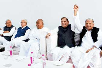 এখন: বৃহস্পতিবার দিল্লিতে মুলায়ম, শরদ যাদব, দেবগৌড়া, লালুপ্রসাদ ও নীতীশ। ছবি: পিটিআই।
