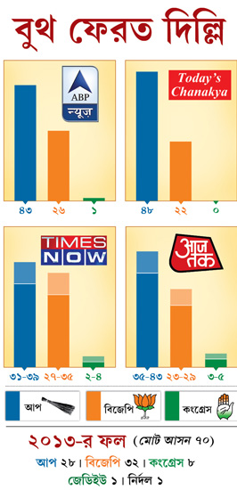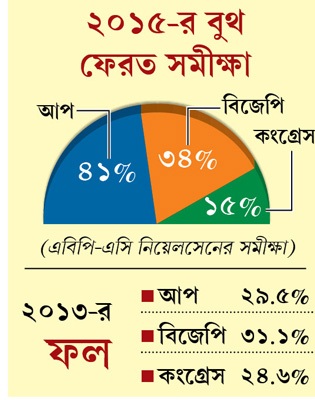 এ দিন এবিপি নিউজ-এসি নিয়েলসেন তাদের বুথ ফেরত সমীক্ষায় জানিয়েছে, কেজরীবালের আম আদমি পার্টি পেতে পারে ৪৩টি আসন, বিজেপির কপালে জুটতে পারে ২৬টি আসন এবং কংগ্রেস মাত্র একটি আসন পেয়ে তলানিতে ঠেকতে পারে। অন্য প্রায় সব ক’টি বুথ ফেরত সমীক্ষাতেই এর কাছাকাছি পূর্বাভাস দেখা গিয়েছে।