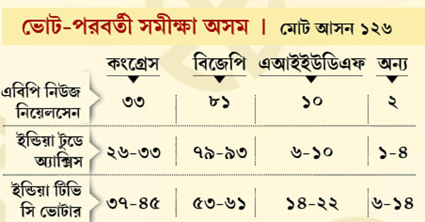ভোটের আগে জনমত সমীক্ষায় দেখা যায় অসমে কোনও দলই নিরঙ্কুশ সংখ্যাগরিষ্ঠতা পাবে না। কংগ্রেসের থেকে বিজেপি বড়জোর ৫-৭টি আসন বেশি পাবে। তাই এআইইউডিএফের সাহায্য নিয়েই হয় কংগ্রেস না হলে বিজেপি জোটকে সরকার গড়তে হবে। কিন্তু সিংহভাগ নির্বাচন-পরবর্তী সমীক্ষাই বলছে সংখ্যাগরিষ্ঠতা নিয়েই আসতে চলেছে বিজেপি জোট। নামনি অসম ও সংখ্যালঘু অধ্যুষিত এলাকায় এআইইউডিএফের আধিপত্য আগের মতো থাকবে না বলে আঁচ করেছিলেন অনেকে। ওই ভোটে কংগ্রেস ভাগ বসাবে বলে ধারণা ছিল তাঁদের। সমীক্ষাতেও তারই প্রতিফলন। ২০টির বেশি আসনের দাবি করা আজমলের দলকে গড়ে ৬ থেকে ১০-এর বেশি আসন দেওয়াই হচ্ছে না।