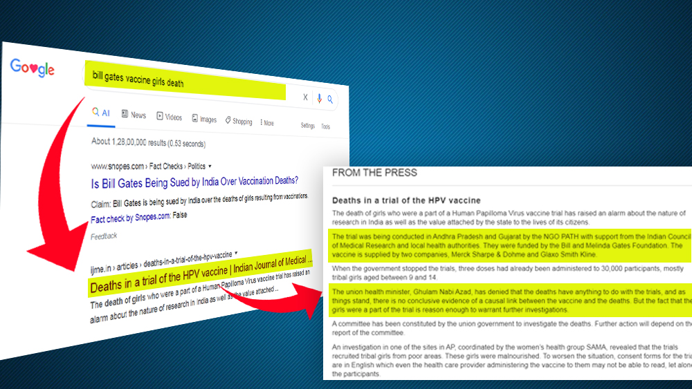 বিল গেটস বা তাঁর কোনও সংস্থা এমন প্রতিষেধক বানায়নি, গুগ্ল সার্চ থেকে জানা যায় আসল ঘটনা। প্রপার্টি ফর অ্যাপ্রোপ্রিয়েট টেকনোলজি ইন হেলথ নামে একটি মার্কিন সংস্থা সে বছর অন্ধ্রপ্রদেশ এবং গুজরাতে ২৪ হাজার ৭৭৭ কিশোরীর উপর হিউম্যান প্যাপিলোমা ভাইরাস (এইচপিভি)-এর প্রতিষেধকের পরীক্ষামূলক প্রয়োগ করে। মার্কিন সংস্থাটির নানা গবেষণার পৃষ্ঠপোষকতায় ছিল বিল ও মেলিন্ডা গেটস ফাউন্ডেশন। কিন্তু তারা ওই ভ্যাকসিন তৈরি করেনি। প্রতিষেধক নেওয়া সাত কিশোরীর মৃত্যু হওয়ায় সে সময় বিতর্ক হয়। কিন্তু তৎকালীন কেন্দ্রীয় স্বাস্থ্যমন্ত্রী গুলাম নবী আজাদ জানান, ওই মৃত্যুর সঙ্গে প্রতিষেধক প্রয়োগের কোনও যোগ ছিল না।