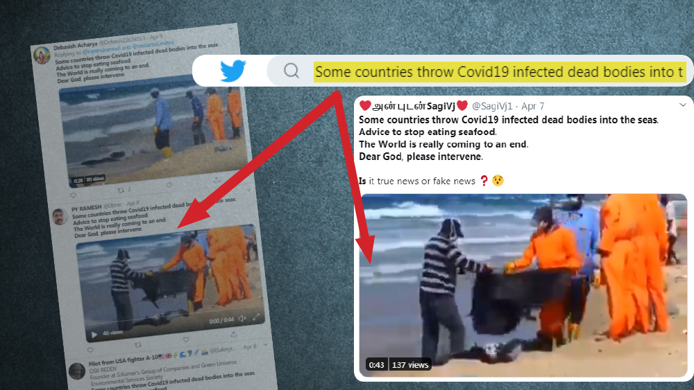 একটি ভিডিয়ো, যেখানে দেখা যাচ্ছে, সমুদ্র সৈকতে ছড়িয়ে ছিটিয়ে রয়েছে মৃতদেহ। ভিডিয়োর সঙ্গে রয়েছে একটি মেসেজ, ‘‘কিছু কিছু দেশ কোভিড-১৯ আক্রান্তদের মৃতদেহ সমুদ্রে ফেলে দিচ্ছে। তাই সামুদ্রিক খাবার না খাওয়ার পরামর্শ দেওয়া হচ্ছে। পৃথিবী শেষের দিকে এগোচ্ছে। হে ঈশ্বর, অনুগ্র্হ করে হস্তক্ষেপ করুন।’’