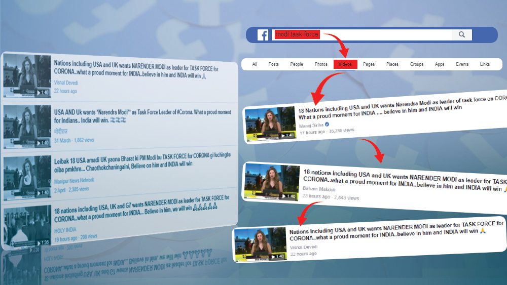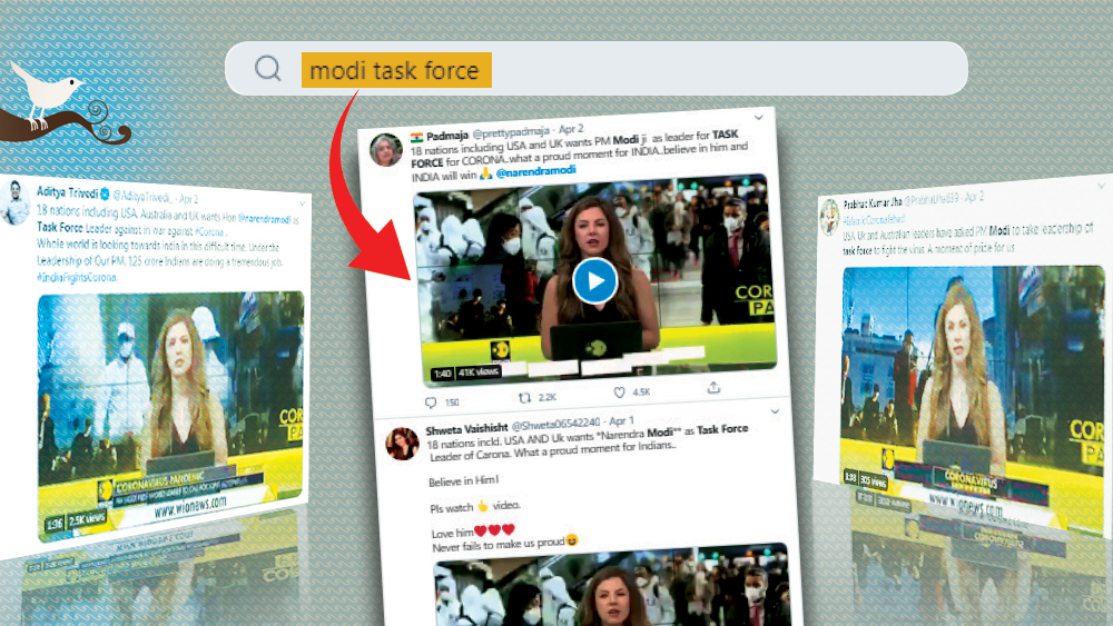 একটি টুইটপোস্ট, যেখানে বলা হচ্ছে, ‘‘মার্কিন যুক্তরাষ্ট্র, ব্রিটেন-সহ ১৮ দেশ করোনাভাইরাস অতিমারির সঙ্গে লড়তে যৌথ টাস্ক ফোর্সের নেতা হিসেবে প্রধানমন্ত্রী নরেন্দ্র মোদীকে দেখতে চায়।’’সেই সঙ্গে জুড়ে দেওয়া হয়েছে ‘উইয়ন’ বলে এক ইংরেজি খবরের চ্যানেলে সম্প্রচারিত খবরের ১ মিনিট ৪০ সেকেন্ডের একটি এডিট করা ভিডিয়ো।