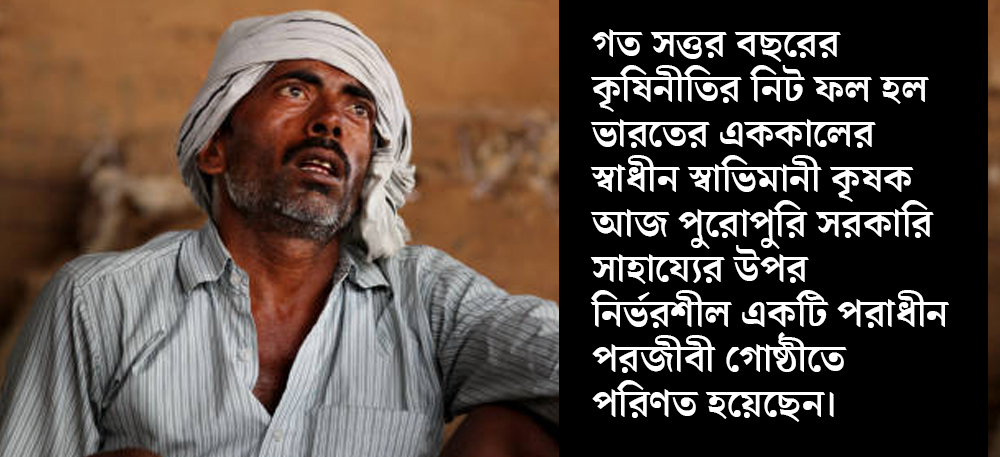 ভারতের মতো কৃষিপ্রধান দেশে উন্নয়নের সমস্ত পলিসি তৈরি হওয়া উচিত ছিল কৃষি ও কৃষককে কেন্দ্রবিন্দু করে। দুর্ভাগ্যবশত, স্বাধীনতার পর থেকে সরকারতন্ত্র কৃষককে কেবল নির্দেশ দিয়ে এসেছেন তাঁদের কী করনীয় এবং ভারতবর্ষের অন্নদাতা শুধুমাত্র সেই আদেশ পালন করেছেন মাত্র। ফলে কৃষি অলাভজনক হয়ে পড়েছে , জমি বন্ধ্যা হয়ে গিয়েছে, খাদ্য বিষে পরিণত হয়েছে, ভূগর্ভস্থ জলস্তর তলানিতে গিয়ে ঠেকেছে, পরিবেশ দূষিত হয়েছে আর কোটি কোটি কৃষক ভূমিহীন, রোজগারহীন হয়ে অস্থায়ী শ্রমিকের কাজ করার জন্য গ্রামছাড়া হতে বাধ্য হয়েছেন। বিজ্ঞানের নামে, উৎপাদন বৃদ্ধির নামে আর আধুনিক প্রযুক্তির নামে ভারতের দশ হাজার বছরের কৃষি সংস্কৃতিকে ধ্বংস করে দেওয়ার পরিকল্পিত চেষ্টা চলেছে এত দিন। সরকারের পর সরকার এসেছেন, কৃষককে ভর্তুকি দিয়েছেন, ঋণ মাফ করেছেন, সম্মাননিধি দিয়েছেন, বিনাশুল্কে বিদ্যুৎ দিয়েছেন, ন্যূনতম সহায়তা মূল্য দিয়েছেন, আত্মহত্যা করলে ক্ষতিপূরণ পর্যন্ত দিয়েছেন কিন্তু কৃষিক্ষেত্রকে আত্মনির্ভর এবং স্বাবলম্বী হতে দেননি। গত সত্তর বছরের কৃষিনীতির নিট ফল হল ভারতের এককালের স্বাধীন স্বাভিমানী কৃষক আজ পুরোপুরি সরকারি সাহায্যের উপর নির্ভরশীল একটি পরাধীন পরজীবী গোষ্ঠীতে পরিণত হয়েছেন। এই ব্যবস্থার পরিবর্তনের প্রয়োজন ছিল বৈকি। তাই কৃষি আইনগুলির পরিমার্জন অবশ্যম্ভাবী হয়ে পড়েছিল, এ বিষয়ে কোনও সন্দেহ নেই।