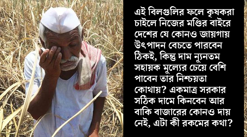 চার) কেন্দ্রীয় অর্থমন্ত্রী তাঁর বাজেট বক্তৃতায় বলছিলেন যে আগামী পাঁচ বছরে ১০ হাজার এফপিও বা ফার্মার প্রোডিউসার অর্গানাইজেশন গড়ে তোলা হবে। এখন যে কয়েকশ এফপিও আছে, সেগুলোর মধ্যে কতগুলো আসলে লাভজনক? হাতে গুনে বলা যাবে। এগুলি বেশিরভাগই মূলধন, ক্যাপাসিটি বিল্ডিং আর ভ্যালু চেন ইনভেস্টমেন্টের অভাবে ধুঁকছে। ফলে সরকার এ বার কর্পোরেটকে এফপিও-র সদস্য হবার খোলা ছুট দিলেন। ভাল কথা। কিন্তু এই বিলগুলির মূল উদ্দেশ্য তো কৃষকের আয় বৃদ্ধি, সেই উদ্দেশ্য কি কর্পোরেট পূরণ করবে? যে সমস্ত কর্পোরেট সরাসরি কৃষিকাজের সাথে যুক্ত নয়, তাদের কেন এফপিও-র সদস্য হতে দেওয়া হবে, এই মৌলিক প্রশ্নটি ভারতীয় কিষান সঙ্ঘ তুলেছে। কিন্তু যতদূর জানি, এখনও সরকারের পক্ষ থেকে কোনও সদুত্তর পাওয়া যায়নি।