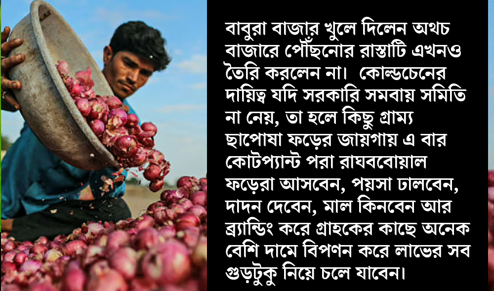 তিন) মাঠ থেকে খাবার টেবিল পর্যন্ত পৌঁছনোর পথে পচনশীল কৃষিপণ্যের ক্ষেত্রে কোল্ড চেন একটি মস্ত বড় ভূমিকা পালন করে। সরকারের ঘোষিত বাজেট অনুযায়ী দেশ জুড়ে এক লক্ষ কোটি টাকার কোল্ড স্টোরেজ গড়ে তোলা হবে এবং কোল্ড ট্রেনও কৃষিপণ্য পরিবহণে সহায়তা করবে। কবে হবে? যত দিন না হচ্ছে, তত দিন কি পচনশীল পণ্য বেচা-কেনা বন্ধ থাকবে? সে ক্ষেত্রে কর্পোরেট কি হাত গুটিয়ে বসে থাকবে? আর একবার তারা সাপ্লাই চেন সিস্টেমে ঢুকে পড়লে, কৃষক পণ্য বিপণনের জন্য কর্পোরেটের উপর নির্ভরশীল হয়ে পড়লে, ক্ষেত থেকেই ফসল বিক্রির নিশ্চয়তা বাড়লে, আখেরে তাতে কৃষকের রোজগার বাড়বে তো? এই যে এখন আমরা ৩৫ টাকা কেজি পাইকারি দরে আলু কিনছি, সেগুলো কোল্ড স্টোরেজে ঢোকার সময় কৃষকের কাছ থেকে কী দামে কেনা হয়েছিল কেউ কি ভেবে দেখেছেন? এতে কি কৃষকের আয় এক পয়সাও বেড়েছে?