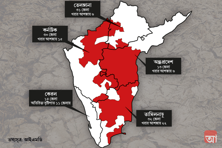 কেরল ও অন্ধ্র উপকূল বাদ দিলে দক্ষিণ ভারতের প্রায় অর্ধেক অঞ্চলেই খরার প্রকোপ দেখা দিতে পারে। তামিলনাড়ু, কর্নাটক, তেলঙ্গানা ও রায়লসীমার মোট ৯৫ টি জেলার ৪৭ টিতেই ২০ শতাংশ কম বৃষ্টিপাত হয়েছে। পাঁচ জেলার অবস্থা সঙ্গীন। সেখানে প্রায় ৬০ শতাংশ কম বৃষ্টিপাত হয়েছে।